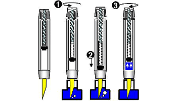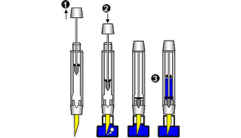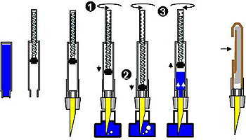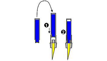 | カートリッジを差し込み、突起に押し当てカートリッジに穴を開けることでインクを供給する。携帯に便利で比較的低価格のものに多い。世界共通規格のものが主流だが老舗メーカーは独自の規格のものを使用することが多い。 | |