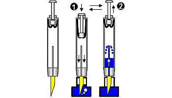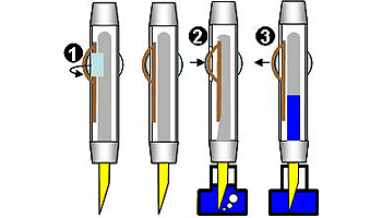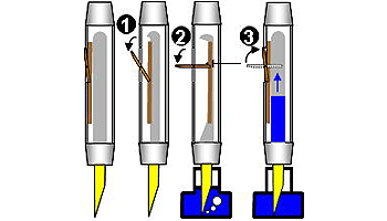 | 首軸をはずし、スポイトなどでインクを吸い上げ胴軸にインクを補給する。大量のインクを入れることが可能だが、体温や気圧の変化で胴軸内部の気圧が高まるとインクがボタオチしやすい。1920年代主流であった吸入方式。 | |