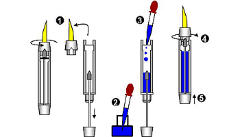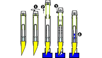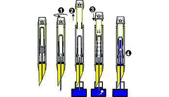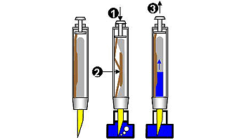 | 尻軸を回すと、ペン芯内部から、管がせり出し、さらに、尻軸を引き、押し戻すとラバーサックが押し潰されその復元力でインクを吸い上げる。多くのシール部品を必要とするが、首軸、ペン先をインクに浸ける必要が無いためインクが付着しにくいメリットがある。シェーファーの固有技術。 | |
