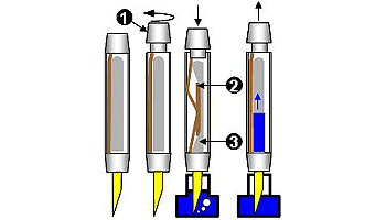 | 尻軸をはずして引き上げ、押し戻すことで中のラバーサックを押しつぶし、その復元力でインクを吸い上げる。シェーファーの専売特許。 | |