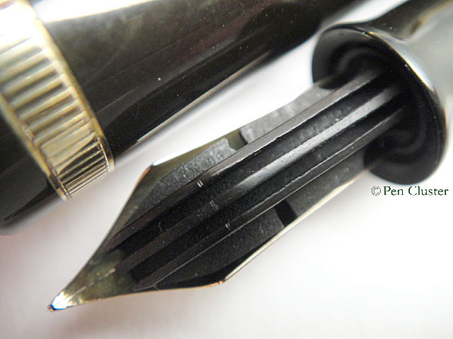 前期モデルはキャップ部分がハードラバー(エボナイト)製でバレルはすべてセルロイド。首軸に段差が有り、バレルとは別体構造。しかし、普通分離は出来ない。
